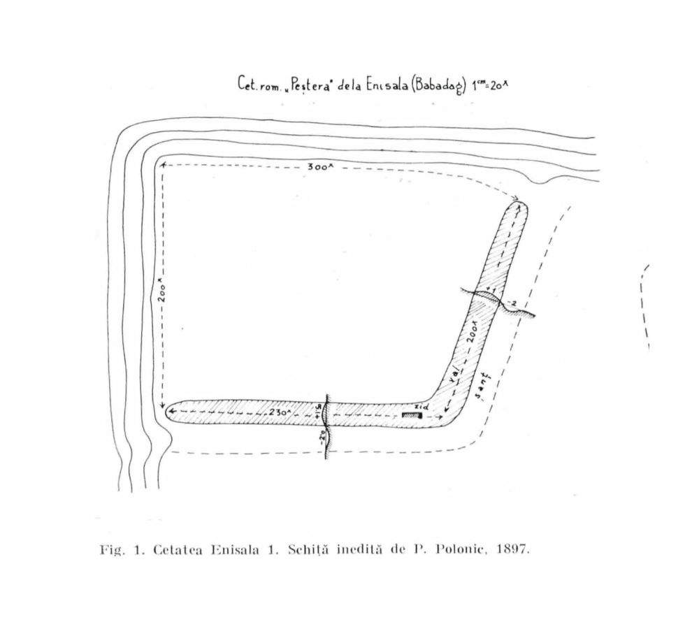 Desenul este o schiță a fortificației romano-bizantine de la Enisala - Peștera. |