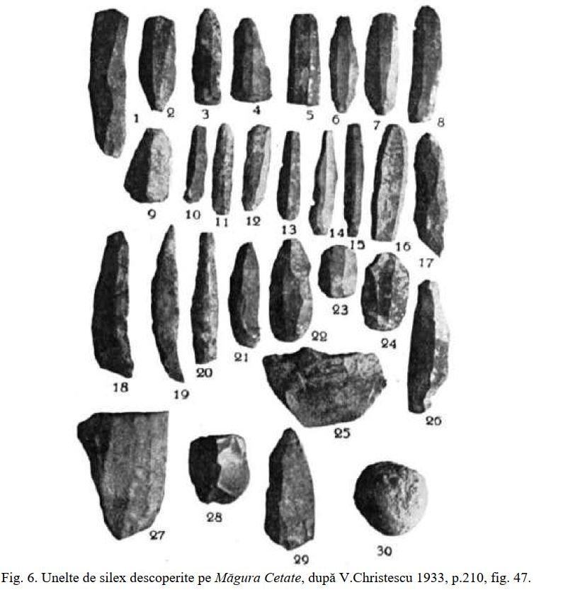 Unelte de silex descoperite pe Măgura Cetate în urma cercetărilor arheologice din 1926 |