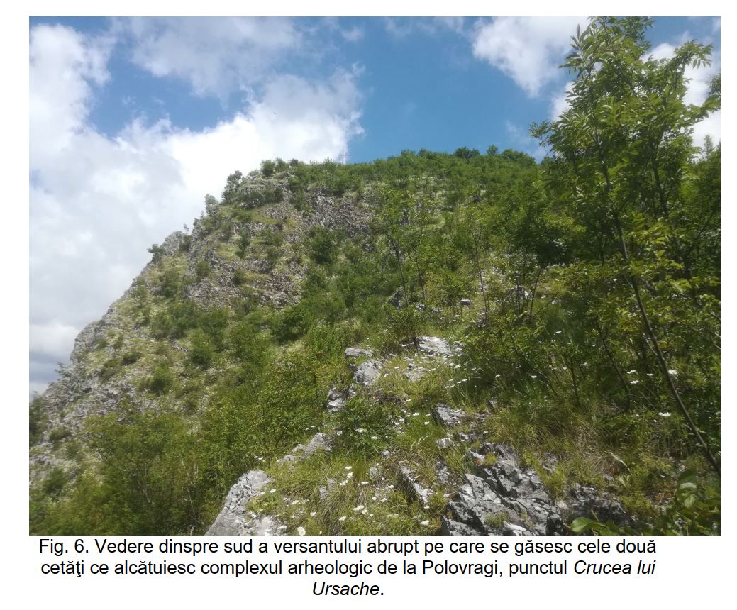 Vedere dinspre sud a versantului abrupt pe care se găsesc cele două cetăţi ce alcătuiesc complexul arheologic de la Polovragi, punctul Crucea lui Ursache. |