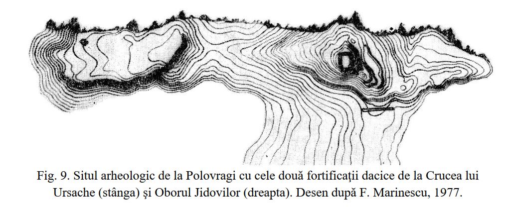 Situl arheologic de la Polovragi cu cele două fortificaţii dacice de la Crucea lui Ursache (stânga) şi Oborul Jidovilor (dreapta). Desen după F. Marinescu, 1977. |