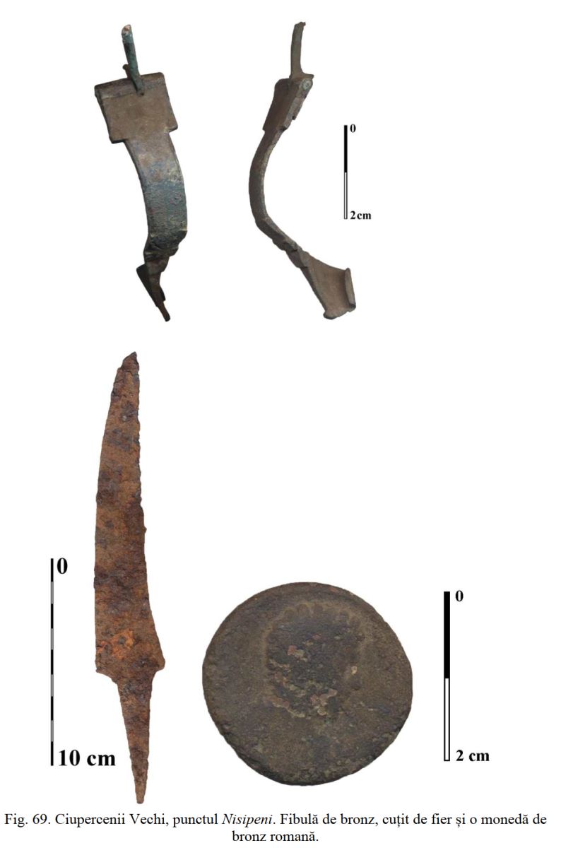 Fibulă de bronz, cuțit de fier și o monedă (?) de bronz romane, descoperite în punctul de la Ciupercenii Vechi, punctul Nisipeni. |