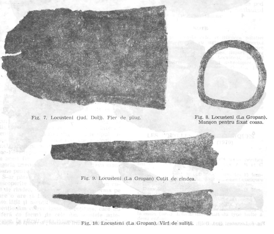 Unelte din metal descoperite în situl La Gropan: fier de plug, manșon de fixat coasa, cuțit de rindea, vârf de suliță. |